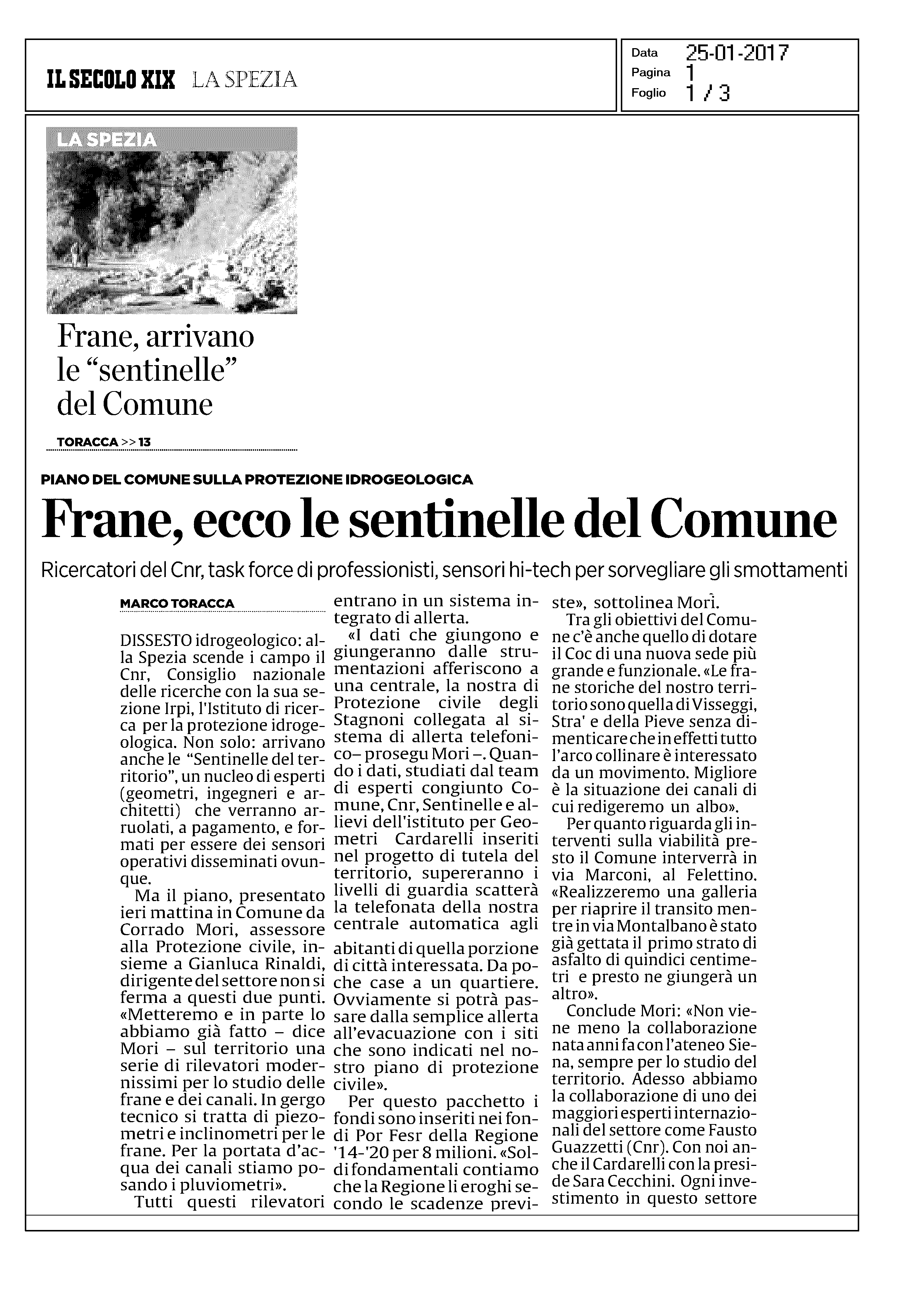 Articolo a firma Marco Toracca pubblicato il 25 gennaio ne Il Secolo XIX, edizione La Spezia, nel quale si descrive il progetto "Sentinelle del territorio" al quale collaborano IRPI e il Comune di La Spezia.